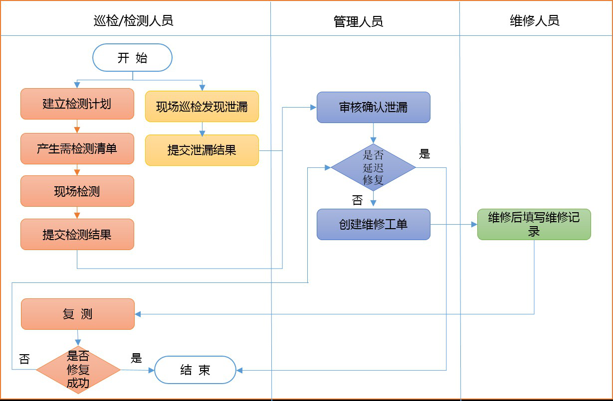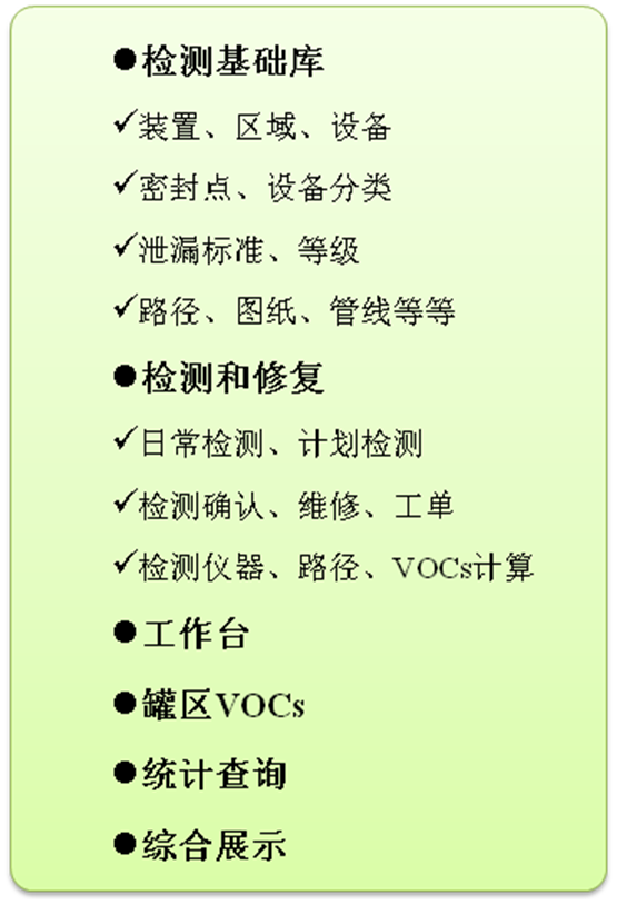 国内外法规要求每月或每季度对石化企业庞大的设备及管阀件检测一次。而检测数据统计及维修管理工作量极大,因此必须建立专业的管理平台,对泄漏检测数据进行记录与统计、泄漏排放量计算、维修记录与评估。同时为企业下一次检测提供必要的方案与数据支持。