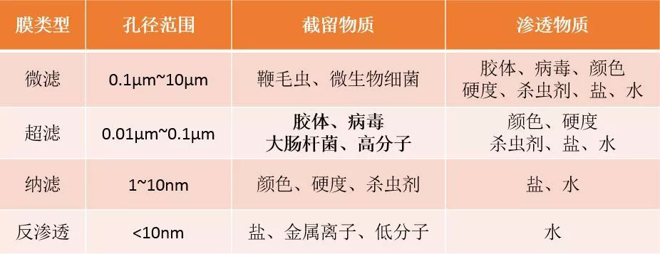 膜按照孔径分可以分为以下4类。目前国内外使用的膜生物反应器大部分滤膜孔径集中在0.05-0.4μm之间,基本介于超滤、微滤膜临界点附近。在如上孔径范围基本上实现了对活性污泥的有效截留,同时确保其运行能耗最低。再大或者再小的空间将不太适应于膜生物反应器技术。