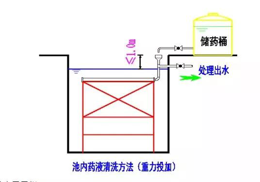 清洗时,一般采用次氯酸钠(浓度为 0. 5% )或草酸(浓度为 0. 5%)两种药液。清洗前首先关闭抽吸泵和鼓风机。将药液通过安装在膜组件上部的进药口重力自流进入膜片内部中,注入药液的量要按照操作说明书给出的量进行控制, 一般清洗每片膜, 每种药剂的用量为3L/5L左右。