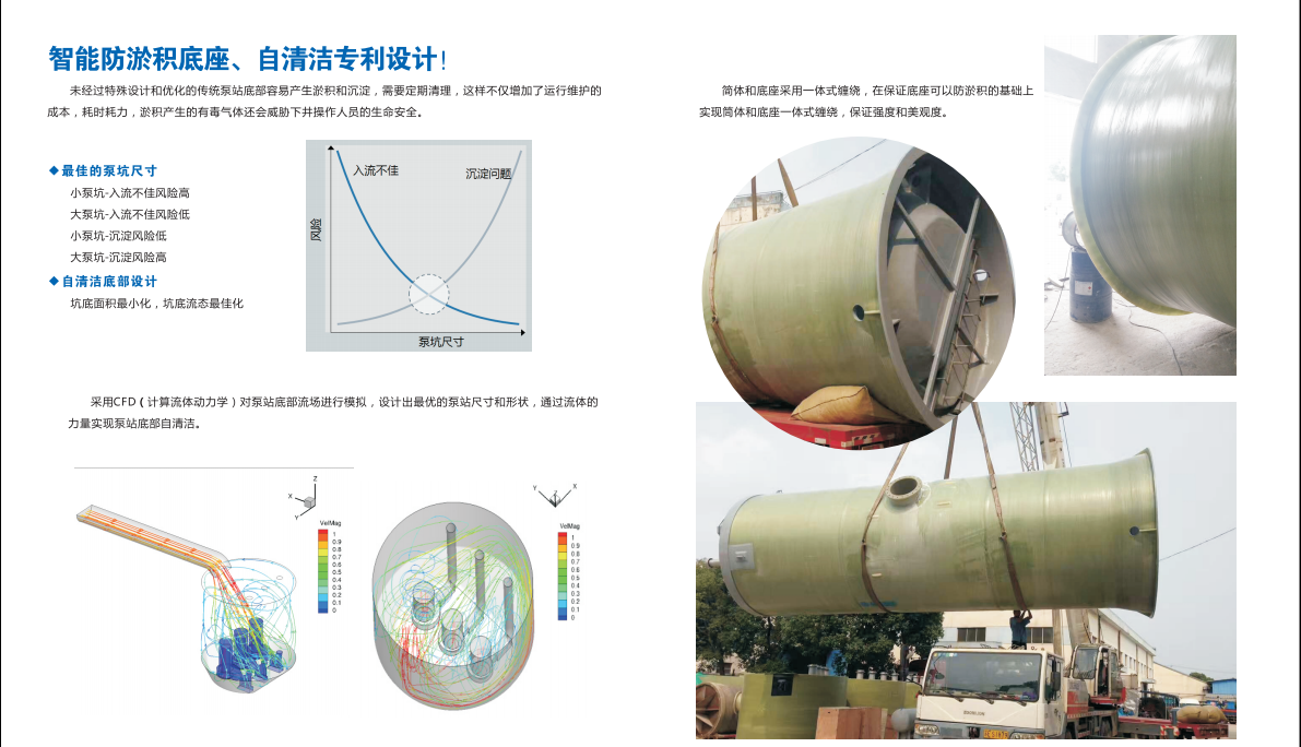 施工环节:混凝土泵站的自身重量非常大,因此它在安装时就需要生产供应商和土建方进行协调,给安装预留出较大的空间,这无疑给延长了泵站的安装周期;另外因为混凝土泵站的重量过重,还导致运输非常的困难,加上它为钢砼结构,泵站底板、池壁、顶板需要分步施工,仅浇注和养护仅需要2-3个月工期。玻璃钢一体化预制泵站的集成度高,所采用的材质重量轻,不仅减轻了运输的压力,同时在制作环节上,只要完成基坑开挖、预制好泵站底板,施工量小且施工周期短,一般一周内即可完成安装。控制系统:传统的混凝土泵站需建专门的控制室,也需要专人进行管理,增加了后期的管理成本;玻璃钢一体化预制泵站采用的是智能管理系统,可以自动对泵站的工作状态进行监控,不需安排专人值守,不仅适用方便,也减少了成本费用。